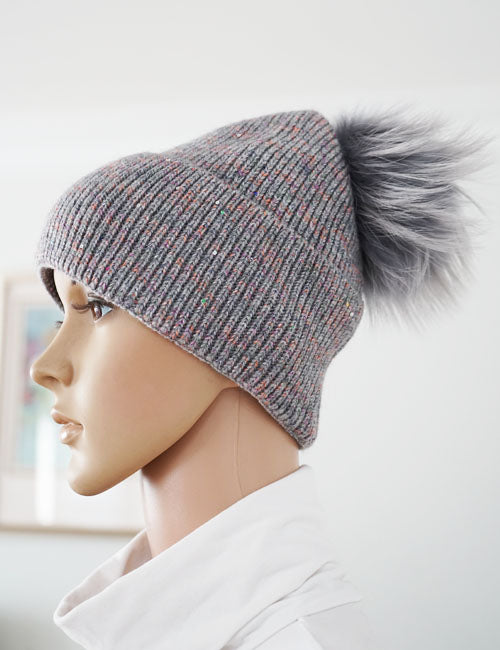 Sparkly Knit Beanie with Fox Fur Pom-Pom-HT2404