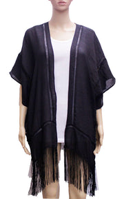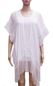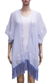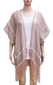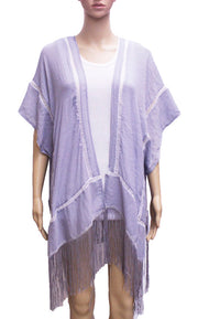 Lightweight kimono cardigan with delicate cutout details and fringe hem. A perfect layering piece for a chic, bohemian look.