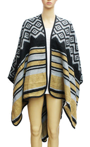 Soft wool-blend poncho with bold geometric and striped patterns. Warm, breathable, and perfect for layering in fall and winter. A stylish statement piece.