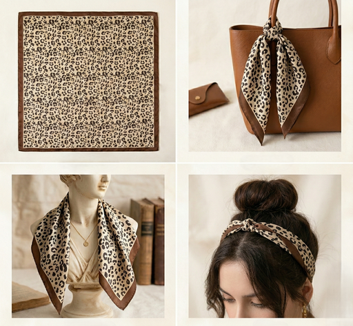 Max Accessories Collection IncChic square scarf with bold leopard and baroque motifs. Lightweight, silky texture perfect for neck, head, or handbag styling. SIZE: 28" X28" 70% V...