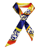 Sleek satin neck scarf with bold leopard and chain patterns, ideal for accessorizing bags, wrists, or hair.