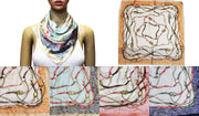 Elegant square scarf with gold chain and buckle print. Soft, silky texture perfect for neck, bag, or hair styling.