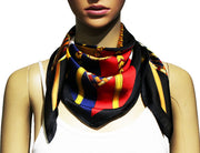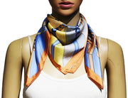 Stylish silk-feel scarf with chain and stripe print. Adds a pop of elegance to any outfit with minimal effort.