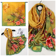 Graceful scarf featuring traditional garden motifs and peonies. Smooth silk-feel fabric adds elegance and cultural charm to any outfit.