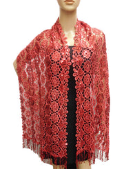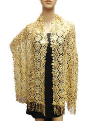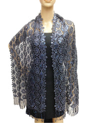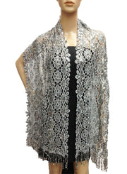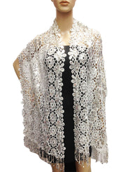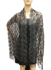 Shimmer with elegance in this stunning evening shawl, featuring intricate lace patterns adorned with sparkling sequins. The delicate beaded fringe adds a luxurious touch, making it the perfect accessory for weddings, galas, and special events.