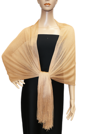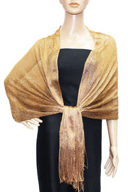 Lightweight metallic shawl with a shimmering finish and elegant fringe. Perfect for evening glam.