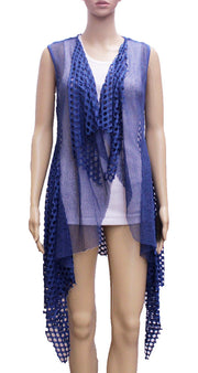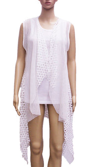 Lightweight mesh vest with draped front and asymmetrical hem. Perfect for layering over casual or chic outfits.
