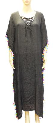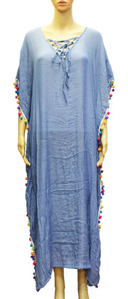 Breezy and elegant kaftan with vibrant embroidery and playful tassels. Perfect as a beach cover-up or a chic summer outfit.
