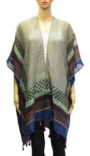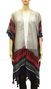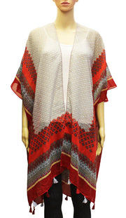 This lightweight kimono features a striking red and white boho print with tassel details. Perfect as a beach cover-up or a stylish layering piece.