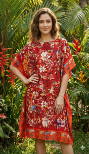 Luxurious silk-feel kaftan with vibrant floral print and relaxed fit—perfect for lounging, travel, or beachside elegance.