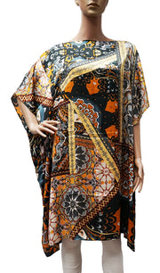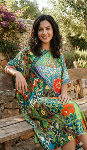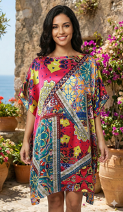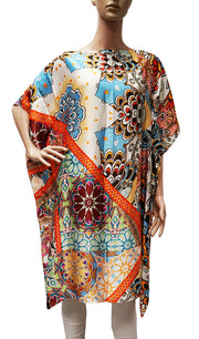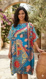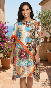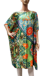 Flowing silk-feel kaftan with bold bohemian patchwork print—perfect for vacation, lounging, or vibrant beach cover-up looks.