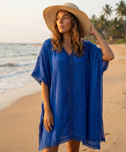 Relaxed-fit beach cover-up with crochet trim and V-neckline—perfect for layering over swimwear on summer getaways.