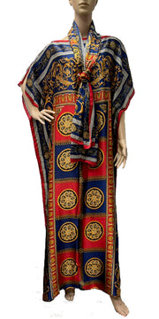 Elegant silk-feel kaftan with baroque-style gold print and matching scarf—perfect for resort wear, events, or lounging.