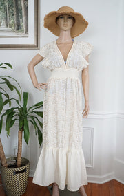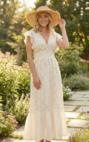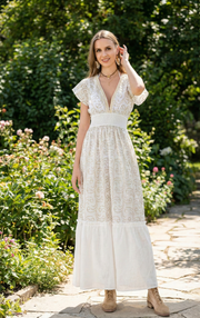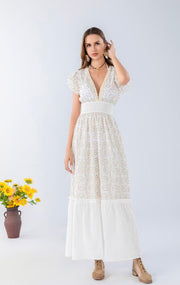 Chic white maxi dress with delicate embroidery, flutter sleeves, and a deep V-neck—perfect for summer events, vacations, and casual elegance.
