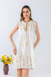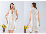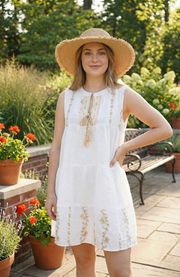 Light and breezy sleeveless dress with delicate embroidery and tassel tie—perfect for summer days, beach walks, and vacations.