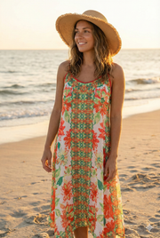 Vibrant floral spaghetti strap dress with flowy handkerchief hem—perfect for beach getaways, summer parties, or tropical vacations.