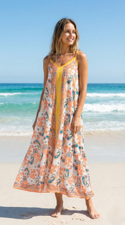 This breezy long slip dress is your shortcut to effortless resort style. The sweeping A-line silhouette is cut from an airy gauze blend of 50 % cotton and 50 % viscose, keeping you cool while vibrant paisley motifs add boho flair. Spaghetti straps and a deep V neckline create a flattering fit, while side slits give the hem carefree movement over swimwear.