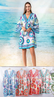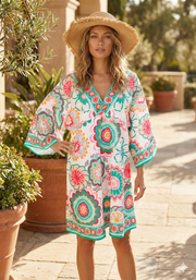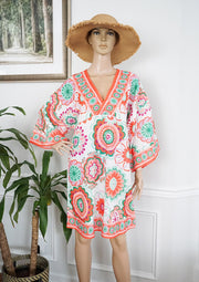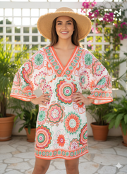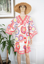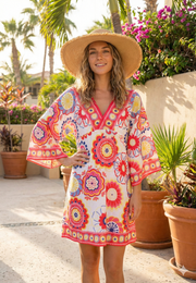 Brighten any beach day with this eye-catching tunic. The lightweight gauze blend of 50 % cotton and 50 % viscose keeps you cool while vivid floral motifs add instant personality. A deep V neckline with contrast border, wide 3/4 sleeves, and an easy mid-thigh length make it the perfect throw-on layer over swimwear.