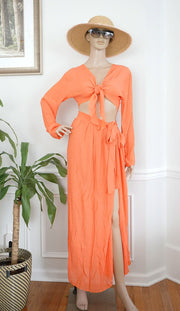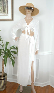 Chic two-piece outfit featuring a tie-front crop top and high-slit skirt—perfect for beach days or tropical vacations.