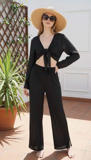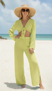 Elevate your pool-to-patio style with this airy two-piece cover-up set. The long-sleeve crop top features a deep V neckline and adjustable front tie, while the matching high-rise pants fall to a relaxed, wide-leg silhouette with subtle side slits. Both pieces are cut from a lightweight gauze blend of 65 % cotton and 35 % viscose, delivering breathable comfort and a soft drape over swimwear.