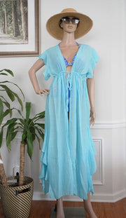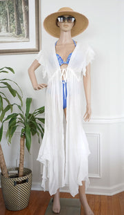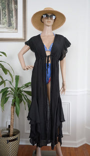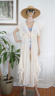 Lightweight, sheer beach cover-up with flutter sleeves and front tie—perfect for layering over swimsuits on sunny days.