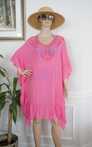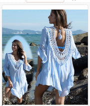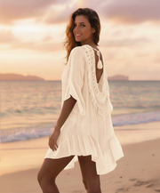 Breezy beach cover-up with crochet back detail, tassel tie, and ruffled hem—perfect for seaside strolls and sunny getaways.