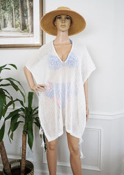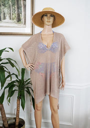 Lightweight sheer beach cover-up with long sleeves and drawstring waist—perfect for layering over swimwear in style.