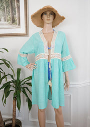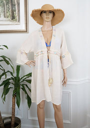 Lightweight boho-style cover-up with embroidered trim and tassel tie—perfect for layering over swimwear on sunny beach days.