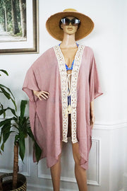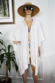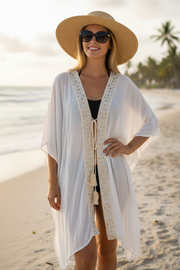 Flowy kimono-style beach cover-up with embroidered trim and tassel tie—perfect for layering over swimwear on sunny days.
