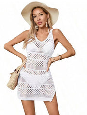 This sleeveless mini dress features a flattering V-neckline and a breezy, open-knit crochet pattern. It’s lightweight and breathable, making it the perfect piece to throw over your swimsuit for a day at the beach or lounging by the pool.