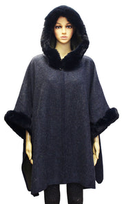 Luxuriously soft and elegant, this hooded poncho features a smooth wool-blend body accented with plush faux fur trim along the hood and sleeves. Designed for warmth and style, it’s perfect for layering on chilly days. Available in neutral tones like light gray and cream.