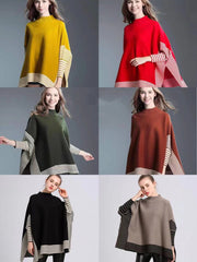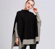Modern poncho with striped trim and sleeve detail. Lightweight, cozy, and effortlessly chic for transitional weather and layering looks.