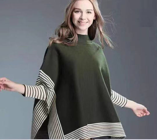 Modern poncho with striped trim and sleeve detail. Lightweight, cozy, and effortlessly chic for transitional weather and layering looks.