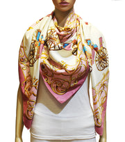 Luxurious scarf with elegant carriage and scroll motifs. Silk-feel texture perfect for styling with formal or casual looks.