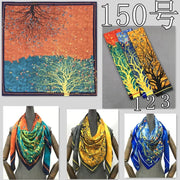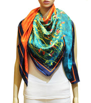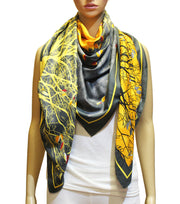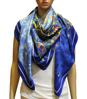 Stylish large square scarf with silky feel and vivid botanical design, perfect for versatile draping and elegant everyday looks.