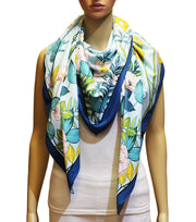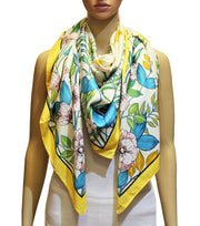Lightweight silk-feel scarf with vibrant tropical flowers and butterflies. Adds freshness and flair to any spring or summer outfit.