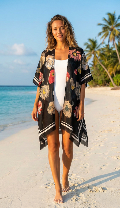 Max Accessories IncElegant floral kimono with relaxed fit and soft texture. Perfect for vacation layering, beach days, or sunny strolls. Size: 33" x 35" 100% Polyester
