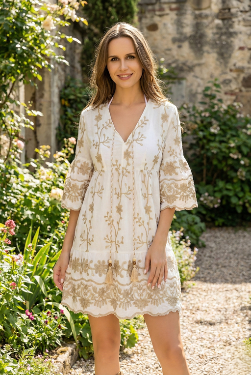 Max Accessories Collection IncElegant V-neck tunic dress with intricate embroidery, flared sleeves, and tassel ties—perfect for sunny days and holidays.