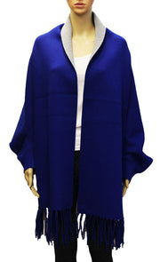 Elegant open-front shawl coat with soft contrast lining and playful fringe trim. A cozy, stylish layer for effortless warmth and sophistication.