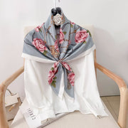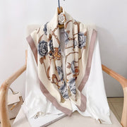 An elegant fusion of vintage baroque chains and blooming roses on a luxurious silk-feel fabric. The deep-toned backdrop enhances the intricate gold details, adding sophistication to any look.
