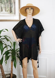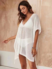 Lightweight sheer beach cover-up with long sleeves and drawstring waist—perfect for layering over swimwear in style.