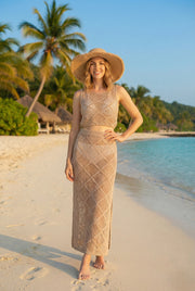 This two-piece set features a matching sleeveless top and a long, flowy skirt with a stylish diamond knit pattern. It's lightweight and breathable, making it the perfect choice to throw over a swimsuit when you're heading from the beach to lunch.